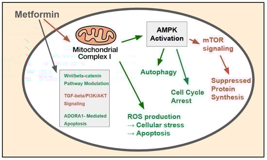 Although AMPK is a primary mediator of the effects of metformin, it also exhibits anticancer activity through pathways that do not rely on AMPK activation, particularly at higher concentrations, which can reach certain tissues such as the colon or specific cellular settings [26]. These alternative mechanisms add to the complex nature of metformin’s action and can lead to different responses depending on the molecular makeup of the tumor.