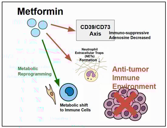 Metformin can alter the immune landscape within the TME, potentially shifting the balance towards an antitumor immune response (Figure 3) [53]. The modulation of immune cells and their interactions within the tumor may be a key part of the therapeutic effect of metformin. Variations in the TME immune composition or the effect of metformin on immune cells may influence treatment outcomes and serve as predictive biomarkers.