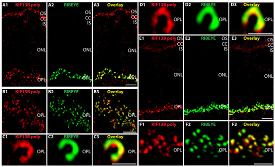KIF13B is strongly enriched at synaptic ribbons of photoreceptor synapses in the OPL. (A–D) Cryostat sections of the bovine retina double-immunolabeled with affinity-purified rabbit polyclonal antibody against KIF13B (red channel, (A1,B1,C1,D1)) and mouse anti-RIBEYE(B)-domain/CtBP2 (clone 2D9) (green channel, (A2,B2,C2,D2)). Overlay is shown in the yellow channel (A3,B3,C3,D3). Please note that under the selected conditions (native, flash-frozen, non-PFA fixed cryostat sections), the antibody against RIBEYE(B)-domain (clone 2D9) strongly labels RIBEYE at synaptic ribbons. Under these conditions, the focal concentration of CtBP2 in the photoreceptor nuclei is too low to become detectable by IF. (E,F) Cryostat sections of the mouse retina double-immunolabeled with affinity-purified rabbit polyclonal antibody against KIF13B (red channel, (E1,F1)) and mouse anti-RIBEYE (clone 2D9) (green channel, (E2,F2)). Overlay of the red channels (E1,F1) and green channels (E2,F2) is shown in (E3,F3). With the KIF13B polyclonal antibody, a strong punctate, horseshoe-shaped KIF13B immunosignal in the OPL was observed that largely overlapped with photoreceptor synaptic ribbons that were visualized by immunolabeling with RIBEYE (clone 2D9) antibody. (A,B,E,F) were obtained by confocal microscopy; (C,D) by super-resolution structured illumination microscopy (SR-SIM). Abbreviations: OS, outer segment; CC, connecting cilium; IS, inner segment; ONL, outer nuclear layer; OPL, outer plexiform layer; IF, immunofluorescence; poly, polyclonal. Scale bars: 5 µm (A,B,E,F); 1 µm (C,D).