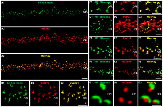(A1–A3) KIF13B is present in the inner plexiform layer (IPL) of the retina close to synaptic ribbons. (A) Cryostat section of the mouse retina double-immunolabeled with mouse monoclonal antibody against KIF13B (clone 5C10) (green channel, (A1)) and rabbit polyclonal antibody against RIBEYE (U2656) (red channel, (A2)). The overlay image is shown in (A3). KIF13B immunosignals are present in the IPL close to the synaptic ribbons that were immunolabelled with anti-RIBEYE. KIF1B immunosignals in the IPL are typically weaker than in the OPL. Abbreviations: ONL, outer nuclear layer; OPL, outer plexiform layer; INL, inner nuclear layer; IPL, inner plexiform layer; mono, monoclonal. Scale bars: 5 µm.
