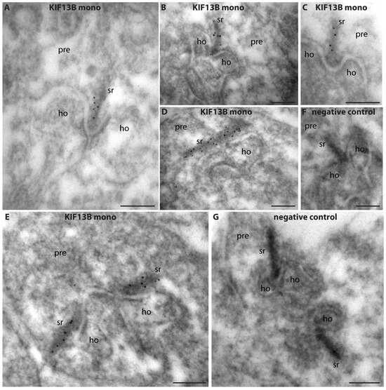 Next, we determined the ultrastructural localization of KIF13B in rod photoreceptor ribbon synapses by using post-embedding immunogold electron microscopy and the monoclonal KIF13B antibody clone 5C10. Post-embedding immunogold labeling with monoclonal KIF13B (clone 5C10) revealed a strong enrichment of KIF13B immunogold particles at the synaptic ribbon in the presynaptic terminals of rod photoreceptor synapses in the outer plexiform layer (Figure 7). The entire synaptic ribbon was covered by KIF13B immunogold puncta (Figure 7A–E). No immunogold labeling was observed in the negative control incubations in which the primary antibody was omitted with all other steps remaining the same (Figure 7F,G).