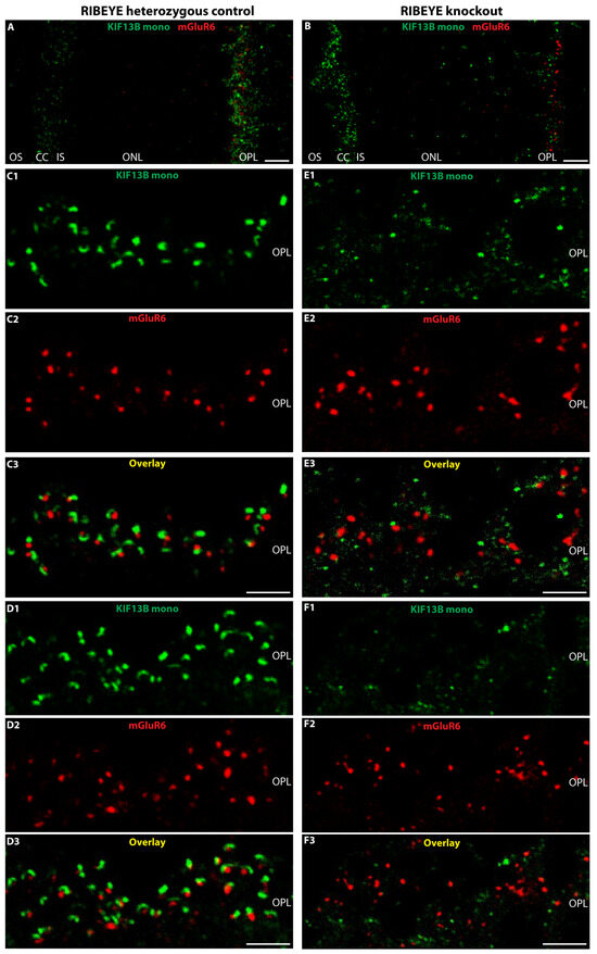 RIBEYE knockout mice lack synaptic ribbons in outer plexiform layer (OPL), as well as in the entire retina [26], and an antibody against postsynaptic glutamate receptor mGluR6 was, therefore, used to mark the OPL. The mGluR6 glutamate receptor is expressed at the dendritic tips of the invaginating bipolar sites close to the presynaptic active zone transmitter release sites [63,64,65]. In photoreceptor synapses of RIBEYE knockout mice, the KIF13B signal at the active zone neurotransmitter release site was less strongly enriched at the presynaptic active zones (Figure 8B) and displayed a more diffuse distribution (Figure 8(E1–E3,F1–F3)) than in the heterozygous control retinas (Figure 8A,(C1–C3,D1–D3)) suggesting that the synaptic ribbon is needed for the focal enrichment of KIF13B at the presynaptic active zone.
