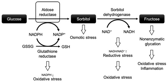 Chronic hyperglycemia contributes to insulin resistance, reduced insulin secretion, and, subsequently, inadequate downregulation of non-insulin-dependent transporters [16,17]. Chronic hyperglycemia not only leads to an increase in ROS but also to a biochemical imbalance, impacting a variety of crucial biochemical pathways, such as the polyol pathway (Figure 1).