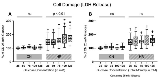 Lactate dehydrogenase (LDH) release after 24 h of (A) glucose or (B) sucrose exposure, 24 h of hypoxia and 2 h of reoxygenation (HR), or control/normoxic (CN) conditions; n = between 28 and 32 per group. All results are normalized to the control group with 25 mM glucose under normoxic conditions (CN 25 mM), which was set to 100%. Data are presented as boxplots (mean indicated by “+”; boxes: 25th–75th percentile; whiskers: min–max). Statistical significance was assessed using ANOVA or Kruskal–Wallis tests as appropriate, with p < 0.05 considered significant. Symbols: † p < 0.0001 vs. CN 25 mM glucose; ns = not significant; * p < 0.05 comparison of glucose/sucrose concentration group after HR vs. HR 25 mM glucose. Comparisons not labeled were not statistically significant. Note: CN 25 mM glucose and HR 25 mM glucose groups are identical in panels (A,B), as they were derived from the same wells on the same plate and are shown in both panels for clarity.