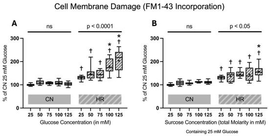FM1-43 incorporation into the cell membrane after 24 h of (A) glucose or (B) sucrose exposure, 24 h of hypoxia and 2 h of reoxygenation (HR) or control/normoxic (CN) conditions; n = between 11 and 12 per group. All results are normalized to the control group with 25 mM glucose under normoxic conditions (CN 25 mM), which was set to 100%. Data are presented as boxplots (mean indicated by “+”; boxes: 25th–75th percentile; whiskers: min–max). Statistical significance was assessed using ANOVA or Kruskal–Wallis tests as appropriate, with p < 0.05 considered significant. Symbols: † p < 0.01 vs. CN 25 mM glucose; ns = not significant; * p < 0.05 comparison of glucose/sucrose concentration group after HR vs. HR 25 mM glucose. Comparisons not labeled were not statistically significant. Note: CN 25 mM glucose and HR 25 mM glucose groups are identical in panels (A,B), as they were derived from the same wells on the same plate and are shown in both panels for clarity.