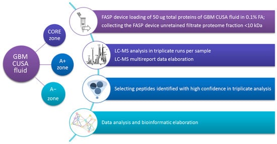 - La Rocca, G.; Simboli, G.A.; Vincenzoni, F.; Rossetti, D.V.; Urbani, A.; Ius, T.; Della Pepa, G.M.; Olivi, A.; Sabatino, G.; Desiderio, C. Glioblastoma CUSA Fluid Protein Profiling: A Comparative Investigation of the Core and Peripheral Tumor Zones. Cancers 2020, 13, 30. [Google Scholar] [CrossRef]