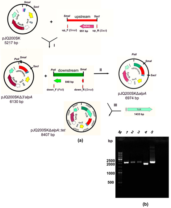 A mutant strain of L. capsici XL1ΔalpA with a deletion in the alpA gene was obtained by homologous recombination. For this, the vector pJQ200SKΔalpA::tet based on the suicide vector pJQ200SK was constructed (Figure 1a, Table 1 in Materials and Methods).