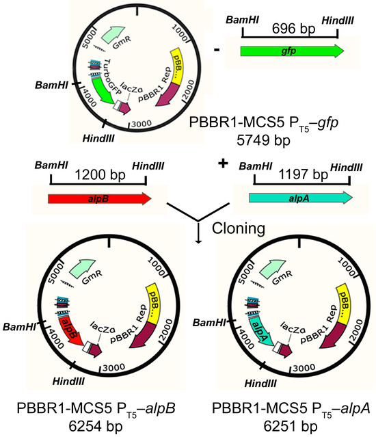 Expression plasmids pBBR1-MCS5 PT5–alpB and pBBR1-MCS5 PT5–alpA were obtained by cloning the 1200 bp alpB (locus_tag = “RJ610_15605”) and 1197 bp alpA (locus_tag = “RJ610_15610”) genes, amplified with L. capsici XL1 DNA using selective primers (Table 2 of Materials and Methods) and subsequently treated with restriction endonucleases BamHI and HindIII (Figure 2) into the pBBR1-MCS5 PT5–gfp vector [16] that we had previously assembled.
