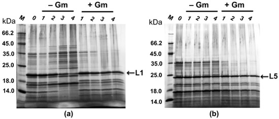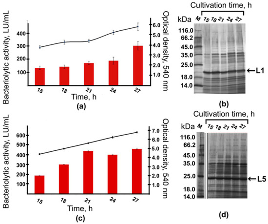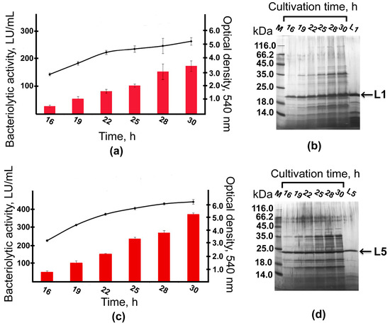 Both strains were shown to reach the end of the exponential growth phase by 22 h of cultivation. No lysis was observed by 30 h of cultivation. The total bacteriolytic activity (total activity of bacteriolytic enzymes in the culture fluid) was observed already by 16 h of cultivation and continued to increase by 30 h to reach 171 LU/mL in the culture fluid of strain PT5–alpA (Figure 3a) and 371 LU/mL in the culture fluid of strain PT5–alpB (Figure 3c). Electrophoretic analysis showed that already by 16 h of cultivation, major protein bands observed in the culture fluid had mobility that coincided with the protein bands of the expressed bacteriolytic proteases L1 and L5 (Figure 3b,d).