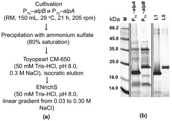 Cells of expression strains PT5–alpA and PT5–alpB were cultivated on RM medium with Gm for 21 h (in flasks) and without Gm for 27 h (in bioreactor). Then, 300 mL of the culture was centrifuged at 7000× g for 20 min to separate cells. Proteins were precipitated from the resulting culture fluid with (NH4)2SO4 to 80% saturation at 4 °C and centrifuged at 22,470× g for 1 h. The protein pellet was suspended in 50 mM Tris-HCl, pH 8.0, and dialyzed against 100 V of the same buffer. Then, a purification scheme was developed. At the first stage, use was made of cation exchange chromatography on a Toyopearl CM-650 column (Merck, Darmstadt, Germany) equilibrated with 50 mM Tris-HCl, pH 8.0. Isocratic elution of proteins was performed with 50 mM Tris-HCl buffer, pH 8.0, containing 0.3 M NaCl. At the second stage, the protein preparation preliminarily dialyzed against 50 mM Tris-HCl, pH 8.0 was applied to an ENrichS column (Bio-Rad, Hercules, CA, USA) equilibrated with the same buffer and connected to the NGC chromatographic system (Bio-Rad, Hercules, CA, USA). Proteins were eluted with a linear gradient of NaCl from 0.03 to 0.30 M. Fractions with bacteriolytic activity and containing electrophoretically homogeneous bacteriolytic proteases L1 and L5 were pooled and stored at minus 20 °C.