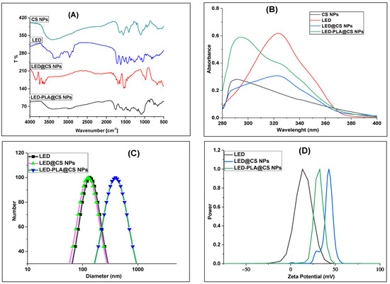 (A) FTIR spectra, (B) UV–vis spectra, (C) DLS of LED, LED@CS NPs and LED-PLA@CS NPs, and (D) zeta potentials.