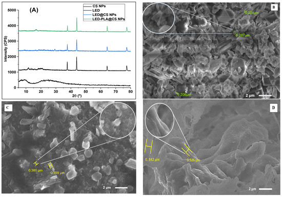 (A) XRD diffractograms of CS NPs, LED and its encapsulated forms; and SEM image of (B) LED, (C) LED@CS NPs and (D) LED-PLA@CS NPs.