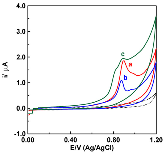 Cyclic voltammograms of 100 µM of (a) LED, (b) LED@CS NPs and (c) LED−PLA@CSNPs in acetate buffer solution at pH 4.8, applying a scan rate of 100 mV/s at a carbon paste electrode (CPE). The dashed curve represents the blank solution.