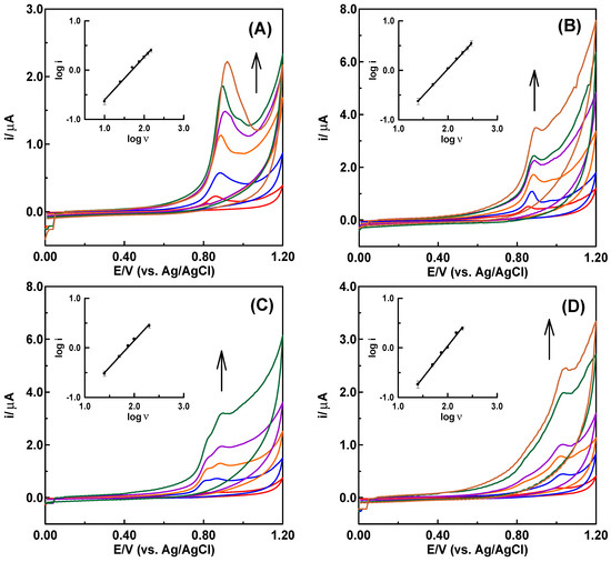 Cyclic voltammograms of 100 µM of (A) LED, (B) LED@CS NPs, (C) LED-PLA@CS NPs and (D) 30 µM of DNA in acetate buffer solution at pH 4.8 at the CPE with increasing scan rates (25 ≤ ν ≤ 200 mV/s). Insets are the log ip-log ν dependences. Arrows show the hyperchromic effects.