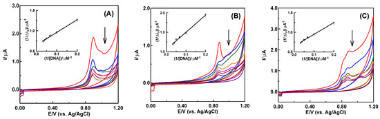 Cyclic voltammograms of increasing additions of DNA (5, 10, 15, 20, 25 and 30 µM) to 100 µM of (A) LED, (B) LED@CS and (C) LED−PLA@CS in acetate buffer at pH 4.8, applying a scan rate of 100 mV/s at a carbon paste electrode. Arrows show the hypochromic effects.