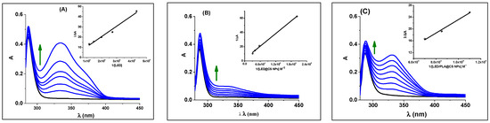 UV–vis absorption spectral changes for DNA in the absence (black lines) and presence (blue lines) of (A) LED, (B) LED@CS NPs and (C) LED-PLA@CS NPs at room temperature. Arrows show the absorbance changes upon increasing the LED, LED@CS NPs, and LED−PLA@CS NPs. The double reciprocal plot to determine the binding constant is shown in the inset. Arrows show the hyperchromic effects.