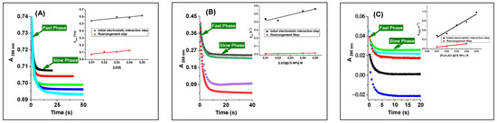 Kinetic trace at 285 nm containing two reaction steps during the reaction of DNA with (A) LED, (B) LED@CS NPs and (C) LED−PLA@CS NPs. Inset: plots of kobs versus different concentration of formulation for the first and second reaction steps with DNA at 296 K.