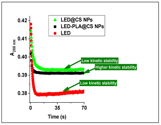 Interestingly, the results also suggest that nanoparticle encapsulation improves the kinetic stability of the drug–DNA complex, particularly when employing the PLA@CS composite nanoparticles system, as shown in Figure 8. The DNA-LED-PLA@CS NPs and DNA-LED@CS NPs complexes showed higher stability over a longer time span than free LED. These mechanistic results from the stopped-flow kinetic analysis provide crucial information for the rational design of nanoparticle drug delivery systems targeting nucleic acids, which may find applications in gene therapy, antiviral treatments, and anti-cancer medication development.