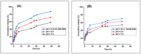In vitro drug release profiles of (A) LED@CS NPs and (B) LED-PLA@CS NPs in PBS at pH 7.4, pH 5.4, and pH 5.4 with 10 mM GSH at 37 °C (n = 1).