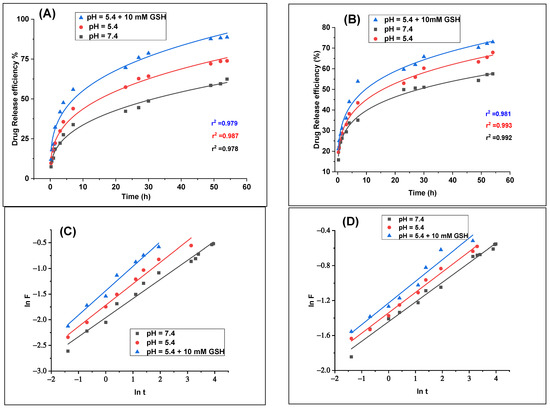 Because it enables us to estimate the release kinetics before creating release systems, mathematical modeling is quite advantageous. Key physical characteristics, such the drug diffusion coefficient and experimental release data, are typically measured in order to develop models. Understanding the drug release kinetics is essential for mathematical modeling, as it impacts all the formulations and is essential for enhancing the solution profiles [86]. We employed models such as the first-order, second-order, Higuchi, and Korsmeyer-Peppas models (Figure 10A,B and Supporting Information) to determine the optimal drug release mechanism. The Korsmeyer–Peppas model was identified as the best fit for modeling the drug release kinetics, based on the highest correlation coefficient (r2) (Table 6). At pH values of 7.4, 5.4, and 5.4, including 10 mM GSH, the r2 values for LED@CS NPs were 0.979, 0.987, and 0.978, and for LED-PLA@CS NPs, they were 0.992, 0.993, and 0.981 (Figure 9A,B and Table 6).