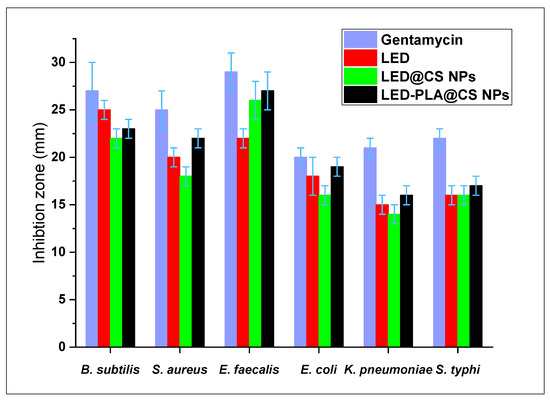CS and PLA@CS NPs loaded with LED were produced using non-covalent interactions, such as the hydrogen bond between the positively charged amino groups in CS and the hydroxyl groups of LED and PLA, with sodium tripolyphosphate (TPP) as the emulsifier, using the ionic gelation technique [37,38].