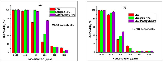 Because of their improved bioavailability, regulated drug release, and effective payload capacity, CS NPs are being utilized more and more [76]. Polylactic acid (PLA) and its copolymers are biocompatible, bioabsorbable, biodegradable via hydrolysis and enzymes, and offer diverse mechanical properties for various applications with low immunogenicity. FDA-approved PLA formulations enhance clinical translatability [77]. Combining PLA with chitosan (CS) improves the hydrophilicity, reduces the initial burst release, enhances the protein adsorption, and addresses the slow degradation [78]. Polymeric nanocarriers provide consistent drug release, a longer systemic half-life, and a higher drug payload compared to other types [79]. According to the UV–vis investigation, the LED-loading efficiency rose as the LED concentration rose. For CS NPs and PLA@CS NPs, the loading content of LED was found to be approximately 13.48% and 71.43% (for 10 ppm), respectively, while the loading level of LED peaked at 44.06% and 89.3% (for 50 ppm). The higher drug-loading efficiency of LED-PLA@CS NPs compared to LED@CS NPs can be attributed to the hydrophobic nature of PLA, which enhances the encapsulation of the poorly water-soluble ledipasvir through hydrophobic interactions. The w/o/w emulsion technique used for LED-PLA@CS NPs allows for better entrapment of the drug within the PLA core, while the chitosan shell provides additional stability and prevents premature drug leakage. This dual-polymer system creates a more robust matrix, increasing the drug payload capacity compared to the ionotropic gelation method used for LED@CS NPs alone. PLA@CS NPs is a promising vehicle and efficient method for our drug delivery because of its higher drug-loading efficiency.