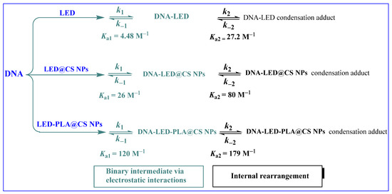 Interaction mechanism of LED, DNA−LED@CS NPs, and DNA−LED−PLA@CS NPs with DNA.
