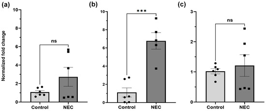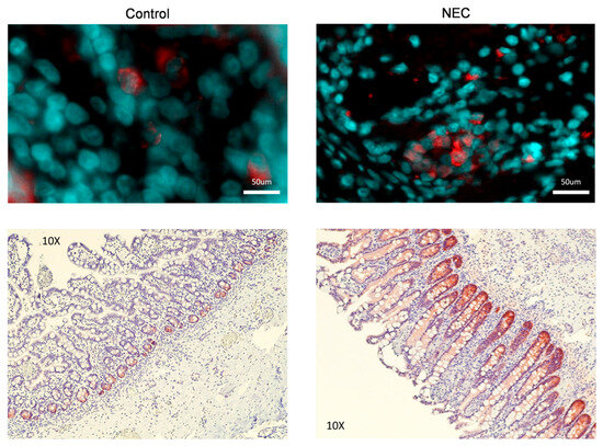 Necrotizing enterocolitis (NEC) is a severe gastrointestinal disorder predominantly affecting premature neonates. It is characterized by intestinal inflammation and subsequent necrosis. Epidemiologically, NEC affects between 7–10% of very low birth weight (VLBW) infants (<1500 g), with its incidence inversely correlated with gestational age and birth weight [1]. Risk factors include prematurity, formula diet, and hypoxia. NEC remains a major cause of morbidity and mortality in neonatal intensive care units (NICUs), with overall mortality rates ranging from 20–30%, increasing significantly in cases that require surgical intervention. Despite years of expansive research, NEC remains a prominent problem, resulting in 1 in 10 of all neonatal deaths, and the primary cause has yet to be identified [2]. The pathogenesis has been determined to be multifactorial. Some factors include intestinal immaturity, aberrant immune responses, and an inability to dampen a hyperinflammatory state [3,4]. These lead to a “leaky gut”—a state of epithelial barrier dysfunction. This, in combination with intestinal dysbiosis, leads to increased pathogen translocation and subsequent sepsis [5].