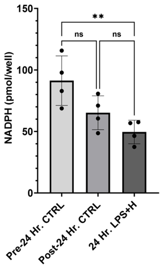 Utilizing our enteroid NEC model, we performed a NADPH assay. There was a trend toward decreased levels of NADPH in enteroids maintained in control conditions after 24 h, but this change was not significant (p = 0.087, −3.78–56.0). Enteroids exposed to 24 h of hypoxia and LPS had significantly decreased amounts of NADPH compared to the initial measurements (p = 0.0091, 11.87–71.62), but similar levels compared to enteroids maintained in control conditions for 24 h (p = 0.3520, −14.22–45.53; Figure 3). Statistical analysis was performed via One-Way ANOVA.