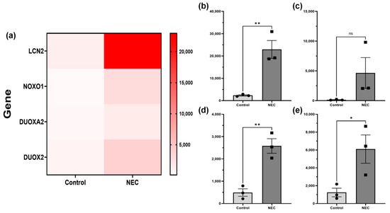 Stranded RNA-seq libraries were constructed using the NEBNext poly(A) mRNA isolation kit with the IDT’s xGen Broad-range RNA Library Prep Kit and the established protocols (New England Biolabs NEBNext, Ipswich, MA, USA, and Integrated DNA Technologies IDT, Coralville, IA, USA). The library construction was completed using 1 μg of RNA. Each of the libraries was indexed during library construction to multiplex for sequencing. Samples were normalized and pooled onto a 150 paired-end run on Illumina’s NextSeq 2000 Platform (Illumina, San Diego, CA, USA). A heat map of LCN2, NOX01, DUOXA2, and DUOX2 as differentially expressed genes in controls vs. NEC was created.