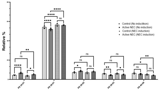 Expression of Phosphatidylserines in Control Versus Active NEC Enteroids Before and After NEC Induction. Lipidomic analysis of PS from control and active NEC enteroids before and after NEC induction. Included are PS 34:01, 36:01, 36:02, 38:03, and 40:06 for their significant differences. Asterisk indicate statistical significance, ns indicates no significance. Error bars represent the standard error of the mean (SEM).