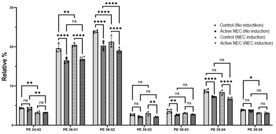 Expression of Phosphatidylethanolamine in Control Versus Active NEC Enteroids Before and After NEC Induction. Lipidomic analysis of PE from enteroids from control and active NEC patients that subsequently underwent NEC induction. Included are PE 34:02, 36:01, 36:02, 38:02, 38:03, 38:04, and 38:05 for their significant differences. Asterisk indicate statistical significance, ns indicates no significance. Error bars represent the standard error of the mean (SEM).