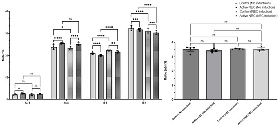 Expression of n6/n3 Ratios in Control Versus Active NEC Enteroids Before and After NEC Induction. Lipidomic analysis of FA and n6/n3 ratios from enteroids from control and active NEC patients that subsequently underwent NEC induction. Included are FA 14:0, 16:0, 18:0, and 18:1 for their significant differences. N6/N3 ratios are included, but not significant. Asterisk indicate statistical significance, ns indicates no significance. Error bars represent the standard error of the mean (SEM).