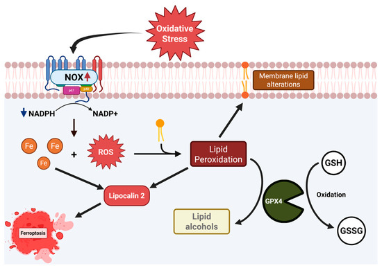 Pictogram Illustrating the Potential Role of Oxidative Stress and Ferroptosis in NEC. A diagram that illustrates oxidative stress and its role in the formation of lipid radicals and iron redistribution, as well as the interplay between NADPH Oxidases and Glutathione peroxidase enzyme families.