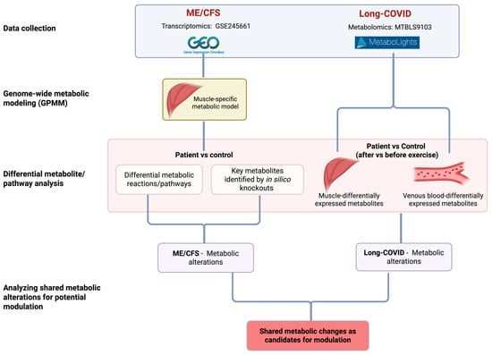 The workflow of omics analyses of the transcriptome data of muscle biopsies in ME/CFS and metabolomics data of muscle and blood in Long COVID. The left panel shows genome-wide metabolic modeling (GPMM) using transcriptomic data of muscle tissues from an ME/CFS study (GSE245661). The right panel shows the analysis of metabolomics data of muscle and blood from a Long COVID study (MTBLS9103). Common changes in metabolism identified in these two patient datasets suggest potential targets for modulation for the diseases.