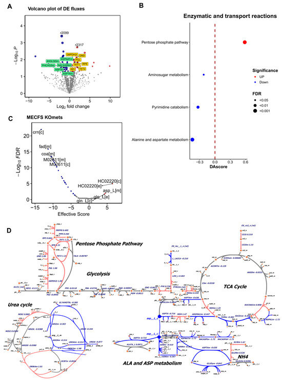 Metabolic modeling of muscle samples of ME/CFS patients. (A) Volcano plot of differentially changed metabolic fluxes between ME/CFS patients and controls (p-value < 0.05, |log2fc| > 0.2). Red, blue, and gray points represent significantly increased, decreased, and non-significant pathways, respectively. (B) Pathway analysis differential changed metabolic fluxes between ME/CFS patients and controls (FDR < 0.05 and |DAscroe| > 0.2). Red, blue, and gray points represent significantly up-regulated, down-regulated, and non-significant pathways, respectively. (C) Metabolite knockout analysis in ME/CFS. Effective scores greater than 0 indicate agonist metabolites, while scores less than 0 indicate antagonist metabolites. Administering an agonist metabolite, e.g., ASP, could potentially rescue the changes observed in patients. (D) Metabolic map of representative pathways and metabolic fluxes. The down-regulated reactions are enriched in alanine and aspartate metabolism in patients. In addition, the down-regulated reactions include reduced urea secretion and a potential increase in NH4 secretion.