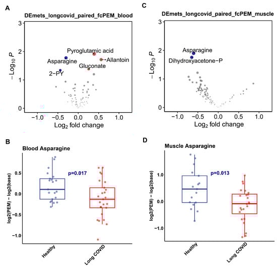 Pair-wise changes of metabolite levels in Long COVID after post-exertional malaise (PEM). (A). Volcano plot of pair-wise metabolic changes in the muscle of Long COVID patients after PEM. (B). Boxplot of changes of asparagine level in the blood between Long COVID and healthy controls. (C). Volcano plot of pair-wise metabolic changes in Long-COVID patient blood after PEM. (D). Boxplot of changes of asparagine in the muscle between Long COVID and Healthy controls.