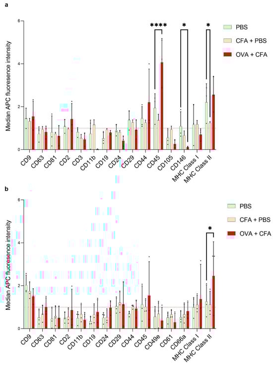 2.6. Surface Marker Profiling Reveals Distinct Immunological Signatures on lEVs and sEVs with Significant Shifts in CD146, MHC II, and CD45 upon OVA + CFA Treatment
