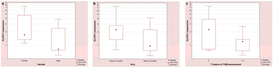 SLFN11 mRNA expression was identified in 21 patients (60%). Higher expression was observed in females compared to males (Figure 1a, p = 0.06), in patients with PFS above 5 months compared to patients with PFS below this value (Figure 1b, 0.05), and in patients with the T4 feature compared to patients with T 1-3 on the TNM scale (Figure 1c, p = 0.08). There was also a significant negative correlation between SLFN11 expression and BMI (R = −0.47, p = 0.03). No statistically significant differences were found between SLFN11 and MET expression in patients with partial response, stabilization, or disease progression.