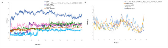 (A) The backbone RMSD of the five systems, including the complex of GnRH, was analyzed during 500 ns MD simulations. (B) During the MD simulation, the Cα-root mean squared fluctuation (RMSF) profile of each amino acid of GnRH was analyzed.