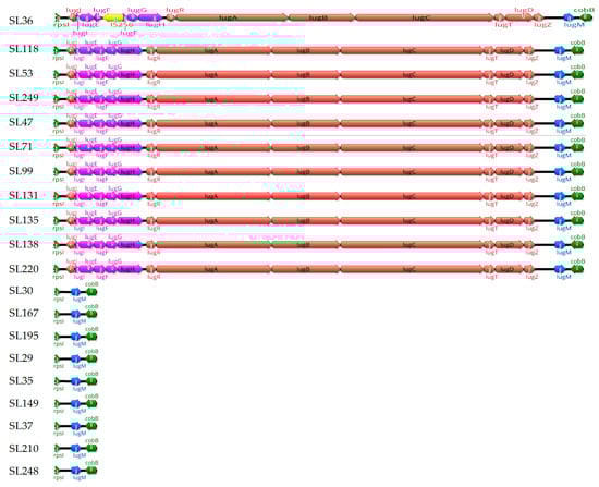 Structural organization of the lugdunin cassette between the rpsL and cobB genes. This figure shows the structural variation in the lugdunin (Lug) cassette located between the rpsI (left) and cobB (right) genes (green) across 20 strains. Eleven strains (SL36, SL118, SL249, SL131, SL138, SL220, SL99, SL135, SL47, SL71, and SL53) possess the full Lug cassette, while nine strains (SL195, SL29, SL35, SL37, SL167, SL248, SL30, SL149, and SL210) contain only the lugM gene (blue). An IS256 insertion (yellow) is observed in strain SL36, which interrupts the lugF gene. Genes encoding non-ribosomal peptide synthetase (NRPS) components (lugA–E) are colored red, and genes encoding the ABC transporter system (lugF–H) are colored pink.