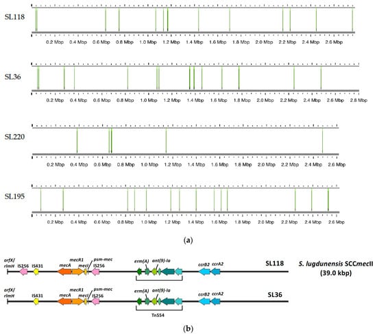 IS256 copy numbers and specific insertion locations in four strains genome. (a) This figure illustrates the copy numbers of IS256 elements and the specific locations of these insertions in four strains: SL36, SL118, SL195, and SL220. Strain SL36 contains 17 copies of IS256. SL118 has 14 copies. SL195 contains 15 copies, and SL220 harbors 7 copies. For the remaining strains, no IS256 elements were detected. (b) This figure shows the structural organization of the SCCmec type II cassette (39.0 kbp) in S. lugdunensis strains SL118 and SL36. In strain SL118, two IS256 elements are present: one located near the mecI gene and the other adjacent to the IS431 element. In contrast, strain SL36 contains a single IS256 insertion located close to the mecI gene.