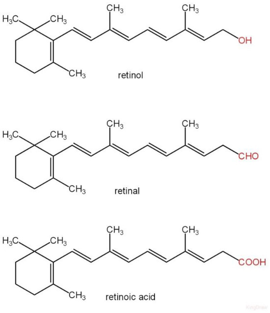 Chemical structures of vitamin A vitamers; structural differences are marked in red.