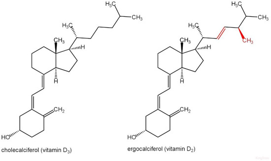 Chemical structure of vitamin D2 and D3; structural differences are marked in red.