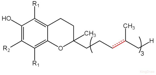 Chemical structure of substances classified as vitamin E. α-tocopherol, R1 = R2 = R3 = CH3; α-tocotrienol, R1 = R2 = R3 = CH3. β-tocopherol, R1 = R3 = CH3; R2 = H; β-tocotrienol, R1 = R3 = CH3; R2 = H. γ-tocopherol, R1 = R2 = CH3; R3 = H; γ-tocotrienol, R1 = R2 = CH3; R3 = H. δ-tocopherol, R1 = R2 = R3 = H; δ-tocotrienol, R1 = R2 = R3 = H.