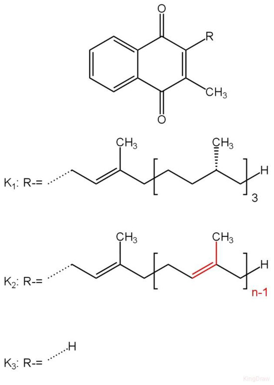 Chemical structures of K1 (phylloquinone), K2 (menaquinone), and K3 (menadione).