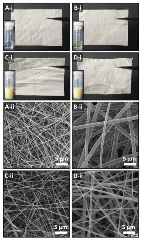(i) Pictures of the electrospinning solutions and the self-supporting webs, and (ii) representative SEM pictures of (A) HPβCD NW, (B) HPγC NW, (C) VA acetate/HPβCD NW, and (D) VA acetate/HPγCD NW. Reproduced/adapted from [45] with permission from The Royal Society of Chemistry.