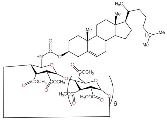 Chemical structure of Heptakis(2,3-di-O-acetyl)-hexakis-(6-o-acetyl)-6I-(cholest-5-en-3-yloxycarbonyl) amino-6I-deoxycyclo-maltoheptaose (Chol-βCD-Ac).