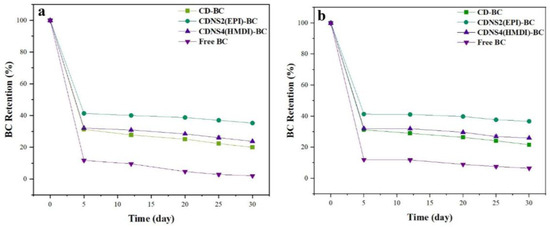 Storage stability of free and encapsulated BC within 30 days at 25 °C under light (a) and in the dark (b). Reproduced from [75] with permission from SNCSC.