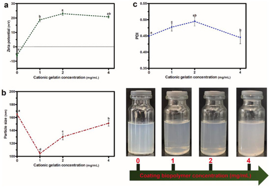 The changes in zeta potential (a), particle size (b), and PDI values (c) of NLPs by coating with different concentrations of gelatin. Data are expressed as mean ± standard deviation (n = 3), and the means followed by different lowercase letters are significantly different at the 5% level in Duncan’s test (p < 0.05). PDI: polydispersity index. Reprinted with permission from [95].